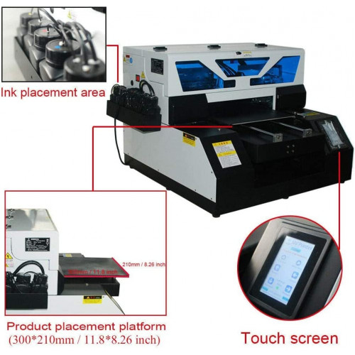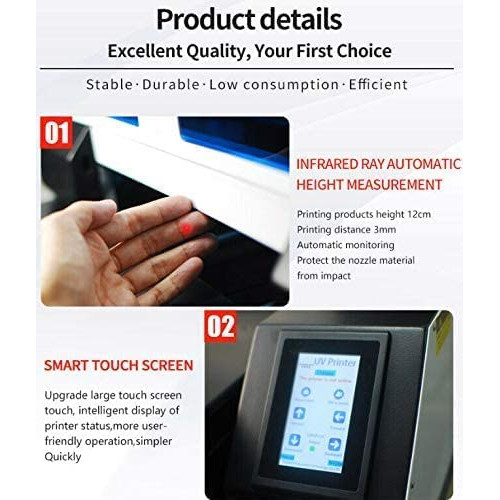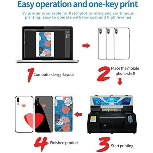 - Pantalla táctil completa y productividad eficiente: el producto acabado se puede obtener en 2 – 5 minutos aplicando la tecnología de impresora UV. Se puede producir en masa, flujo de proceso corto, después de terminar la impresión, no hay necesidad de vapor, procesos posttratamiento como lavado; flexibilidad, los clientes pueden imprimirlo en poco tiempo después de elegir un plan.