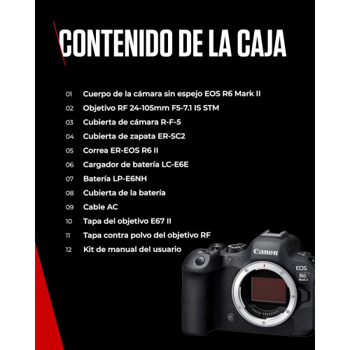 - Cámara sin espejo con sensor CMOS Full Frame de 24,2 MP y procesador DIGIC X ISO102,400 (ext.ISO 204,800) con AF hasta -6.5 EV