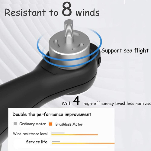 - [4 motores de potencia sin escobillas, resisten 8 niveles de viento]: - El dron está equipado con 4 motores de potencia sin escobillas. Bajo el control del sistema, el rendimiento energético es aún mejor. El índice de resistencia al viento es tan alto como el nivel 8. Funciona a una temperatura
