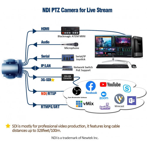 • Conexiones de vídeo: HDMI, 3G-SDI y transmisión IP, RS232 y RS485 (serial), IP (LAN/WAN) y control NDI|HX. Compatible con POE