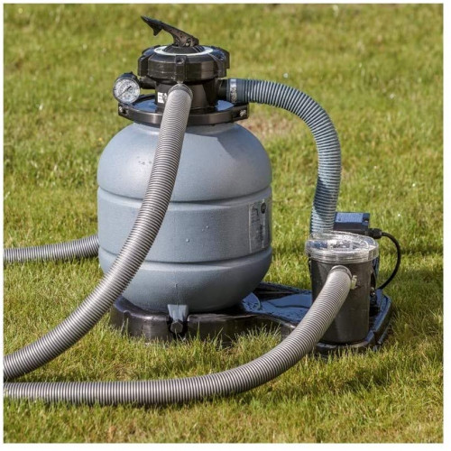 - Con depuradora de arena de 5 m³/h, esta incluye conjunto de skimmer, mangueras de conexión y arena sílex