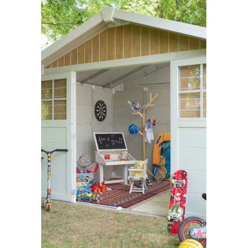 caseta deco 7 sherwood color marron ,,imitacion a madera,aspecto roble Medidas exteriores : Ancho 3.15 mts x alto 2.50 mts x fondo 2.39 mts Dimensiones interiores: ancho 3,06 mts x fondo 2,30 mts Superficie exterior 7,53 m² Superficie útil 7,04 m² Espesor de las paredes 26 mm Altura de las paredes 1,88 m Altura máxima tejado 2,50 m Tejado lamas de carpintería de PVC Pendiente del tejado 20° - 36 % Colores techo gris verde Puertas acristaladas (2) 0,72 x 1,80 m Cristales de puertas (2) L 0,562 x H 0,595 m Tipo de cerradura (1) Maneta + cerradura con llave Tragaluces (1) L 0,682 x H 0,609 m Peso Neto estimado 208 Kg Materiales Carpintería de PVC + metal Accesorios incluidos Kit de fijación - 6x 56cm