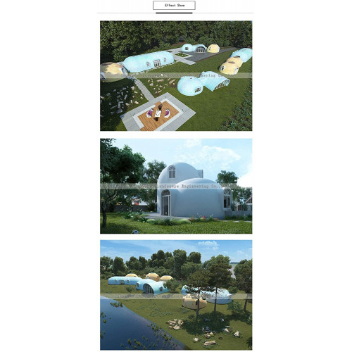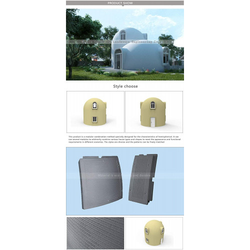 Características del material: poliestireno emisor de grafito (reciclable). Aislamiento térmico, cálido en invierno y fresco en verano. Materiales de aislamiento natural (diferencia de temperatura de 14 grados). Resistencia al viento de grado 12. Soporta un terremoto de magnitud 8. Normas contra incendios de clase B1. Más de 50 años. La forma es variada y se integra totalmente con el paisaje. El período modular puede cambiar el modelo y estilo de la puerta. Alta eficiencia, ahorro de energía y protección del medio ambiente. 6 x 6 x 6,5 m.