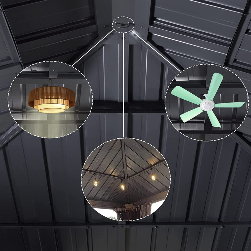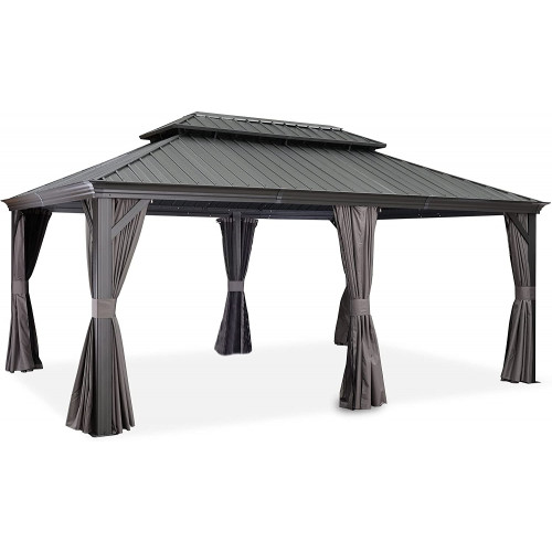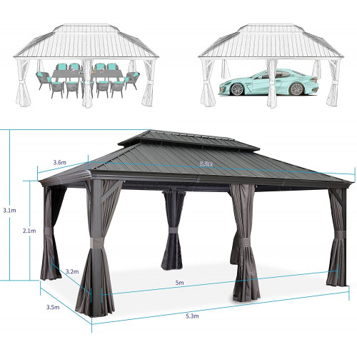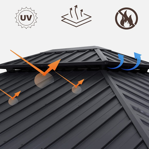 El establo impermeable cenador preparado para el invierno con paneles laterales Doble techo para una óptima ventilación y comodidad, ayuda a soportar fuertes vientos El techo de la glorieta está hecho de aluminio y metal en lugar de tela ordinaria o policarbonato. Las cortinas y redes removibles protegen su privacidad al aire libre Este cenador de techo rígido de jardín de metal se puede utilizar como una carpa de fiesta de cenador de jardín, barbacoa de cenador plegable, cochera, refugio al aire libre y cenador de patio Este cenador con techo fijo seguro que impresionará a tus invitados.