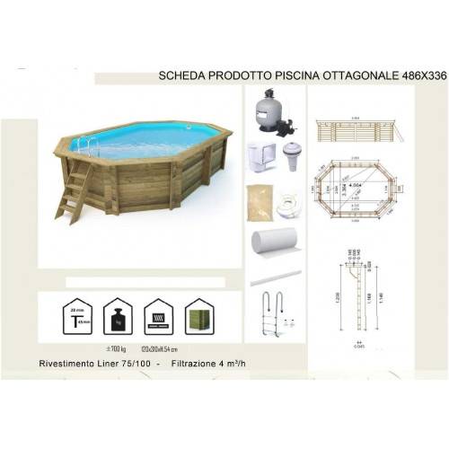 Piscina fabricada en pino impregnado en autoclave, clase 4. Modo constructivo blockhouse. Grosor de las tablas: 4,5 cm. Completo: Liner 75/100, fieltro y perfil de fijación Liner Escalera de madera exterior Escalera de acero interior Sistema de filtración de arena 4 mc/h Skimmer Tubo flexible de conexión Dimensiones 486 x 336 cm Altura exterior 120 cm Altura interior 116 cm Dimensiones embalaje 310 x 120 x 54 cm Peso bruto Embalaje 70 kg 0.
