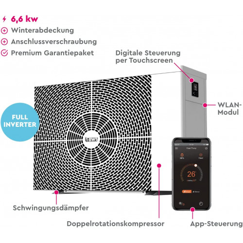 Potencia de calefacción: la bomba de calor tiene una potencia de calentamiento de 6,6 kW y se recomienda para un volumen de piscina de 15 a 30 m³.