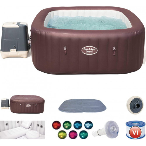 Incluye – Cubierta de madera de fácil montaje, Spa hinchbale Lay-Z-Spa Maldives Hydrojet con luces LED, cobertor, dispensador químico, cartucho de filtro y parche