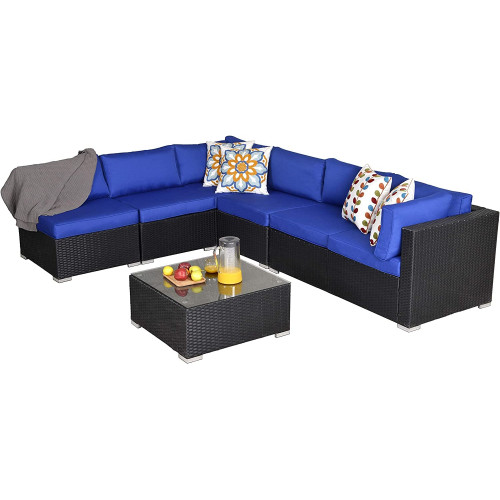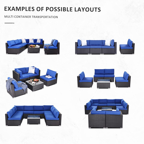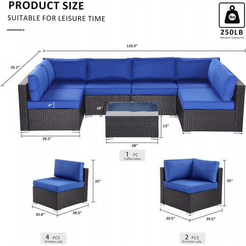 SUNVIVI Outdoor Furniture explora una vida de estilo colorido y acogedor Ya sea para un sofá de gran tamaño y mesa de centro, un sofá con doble silla, una silla doble y 2 sillas laterales, caja de almacenamiento, mesa auxiliar o cualquiera de las otras muchas configuraciones posibles, el SUNVIVI OUTDOOR se adapta a todas sus necesidades cambiantes. El mimbre de resina para todo tipo de clima da el aspecto y el mimbre natural de PE con la durabilidad, la intemperie y la resina UV. Es una opción no tóxica y respetuosa con el medio ambiente. SUNVIVI Outdoor ofrece más opciones de color de este mueble de patio para su elección. Disponible en mimbre marrón clásico con cojines beige o elegante mimbre negro con azul / azul real, el juego de patio siempre proporciona la comodidad y estilo de felpa para fijar tu vida al aire libre. El mobiliario de patio ofrece algo más que un lugar para comer o relajarse en el exterior, también es una extensión de tu espacio de vida interior. Con nuestra selección de muebles de patio al aire libre, podemos ayudarle a crear una experiencia al aire libre que usted y su familia puedan disfrutar durante años. Especificaciones: - Materiales: ratán, poliéster de 250 g, acero. - Material de ratán: mimbre de polietileno. - Color del ratón: marrón/negro. - Color del cojín: beige/azul/azul real. Dimensiones: - Mesa superior de cristal: 28 x 28 x 13 pulgadas. - Sofá sin brazos: 29 x 26 x 25 pulgadas. - Silla de esquina: 29 x 29 x 25 pulgadas. - Grosor del cojín: 4 pulgadas de grosor. El paquete incluye: 4 sofás sin brazos. -2 x sillas de esquina. -1 mesa superior de cristal. - 6 cojines de asiento. - 6 cojines traseros. -2 cojines laterales. - 10 clips de asiento. -1 manual de montaje (idioma español ). Envío en 3 cajas * Por favor, retira o suelta los paños para cubrir los cojines en clima lluvioso y nevado o mientras no se utiliza para garantizar un conjunto de patio de larga duración. *Puede haber diferencias de color entre este producto y tu monitor.