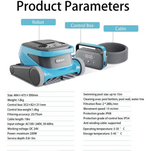 Especificaciones: Nombre del producto: Limpiafondos robótico para piscinas Tamaño del robot: 484x475x300mm Peso del robot: 12 kg Tamaño de la caja de control: 352x82x211mm Peso de la caja de control: 1,6 kg Caudal de filtración: 2 * 280 L/min Velocidad de movimiento: 15m/min Temperatura de funcionamiento: 5-35 ℃ Temperatura de almacenamiento: 5-45 ℃ Precisión de filtrado: 25/75 μm Longitud del cable: 18m/25m Potencia máxima: 220W Profundidad de servicio: 0,8~5m Tamaño de la piscina: 250 ㎡ Limpie el fondo de la piscina, la pared y la línea de agua en el área