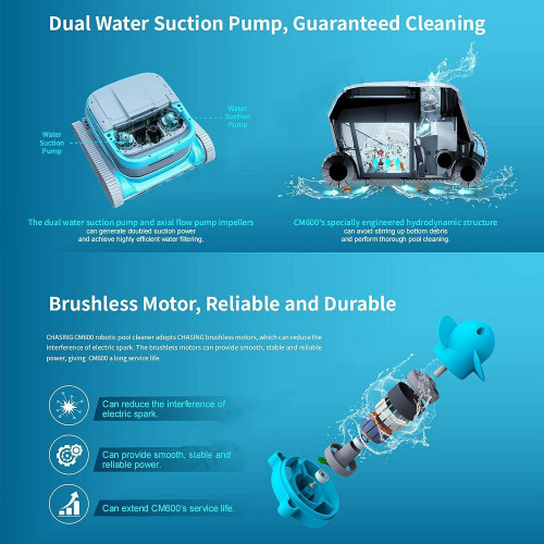 Limpieza completa --- El motor sin escobillas, la bomba de succión de agua dual y el cepillo activo dual pueden garantizar trabajos de limpieza de piscinas completos, efectivos y confiables. La pantalla de filtro de doble capa permite el filtrado estratificado.