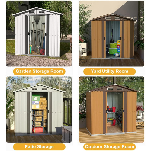 Especificación del cobertizo de almacenamiento: Color: blanco, marrón Materiales: Acero Galvanizado Dimensiones totales: 250x196x212cm Escena aplicable: patio, jardín, terraza, lavadero, cuarto de mascotas