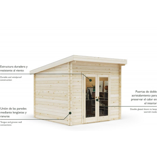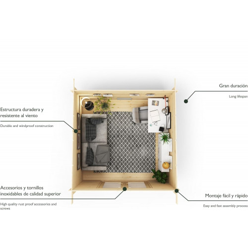 • Oficina en el Jardín: Con sus dimensiones de 3x3m y excelente aislamiento, este pequeño refugio de jardín es ideal para convertir tu oficina en casa en un espacio de trabajo excepcional en tu propio jardín.