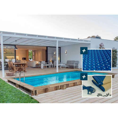Habitat et Jardin Piscina Rectangular de Madera Tobago - 6,20 x 3,00 x 1,31 m + Cubierta de Burbujas de 180 µ - Cubierta de Invierno de 280 g/m²