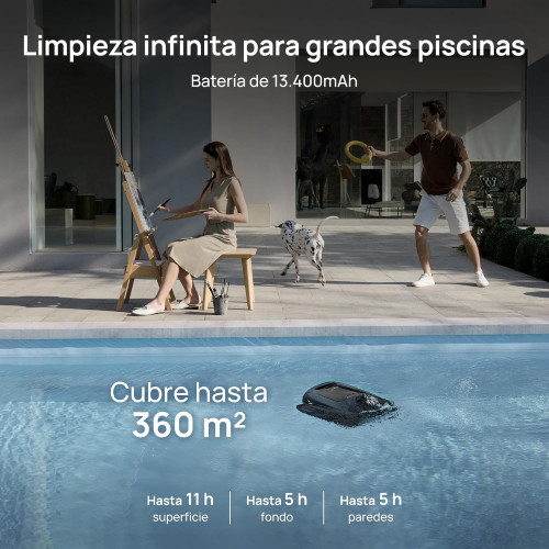 - Hasta 11 horas de limpieza ininterrumpida: con una batería de última generación de 13.400 mAh, podrá disfrutar de hasta 11 horas de limpieza de superficies o 5 horas de limpieza de suelos o paredes con una sola carga. Limpie piscinas de hasta 360 metros cuadrados sin interrupción.