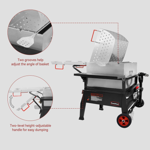 - Diseño fácil de volcar: la cesta perforada inclinable con bisagras hace que sea fácil de drenar. El mango extraíble es ajustable en altura de dos niveles con el nivel superior para el transporte y el nivel inferior para volcar.