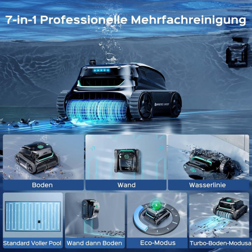 - 7 modos de limpieza y control de aplicación inteligente: con 7 modos de limpieza profesional y 6 rutas de navegación inteligentes para una cobertura completa de la piscina (paredes, suelo, línea de flotación). Limpieza individual, específica o completa por aplicación en una superficie de 300 m²: la solución ideal para piscinas privadas y medianas