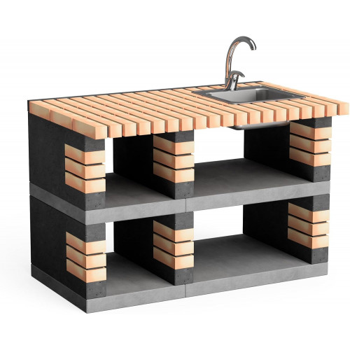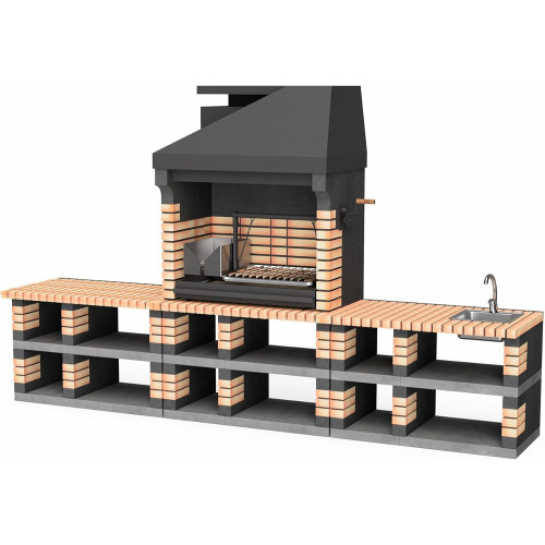 Módulo lateral con lavabo de acero inoxidable y grifo cromado: Añade funcionalidad y comodidad a tu cocina exterior, perfecta para organizar tu espacio mientras cocinas al aire libre.Barbacoa de obra MOVELAR modelo Pack 2 Pan American Orange REF: M00381 fabricada en ladrillo naranja y hormigón refractario. Incluye módulo de soporte lateral con estantes de ladrillo y hormigón, parrilla estilo argentino en acero inoxidable 304 (65x50 cm) con depósito de grasa, cajón metálico para limpieza de cenizas, y sistema de manivela para elevar la parrilla. Módulo lateral con lavabo y grifo cromado. Ideal para hasta 15 personas. No requiere pintura, ideal para exteriores.