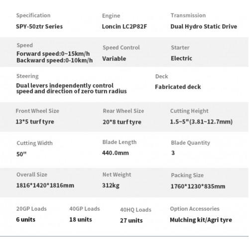 - Características de comodidad: asiento de respaldo alto ajustable y diseño de control ergonómico que reducen la fatiga del operador durante un uso prolongado.Clasificación: bricolaje, industrial, comercial, servicio pesado Desplazamiento del motor: 803 Voltaje: 12 V Altura máxima de corte: 5 pulgadas. Altura mínima de corte: 1.5 pulgadas. Personalización soportada: OEM, ODM, OBM Lugar de origen: Zhejiang, China Modelo: 50ZTR Características: Sin cable, mango de altura ajustable, Mulching, chasis de acero, giro cero en la cortacésped Velocidad de avance máxima: velocidad máxima 10 MPH Fuente de alimentación: gasolina Nombre del producto: Cortacésped Giro Cero Tipo de accionamiento: accionamiento hidrostático dual: 50 pulgadas Altura de corte: 1.5 pulgadas ~ 5 pulgadas Cuchillas: 3 Material: Cubierta soldada resistente Tamaño del neumático delantero y trasero Tamaño: 13 x 5, 20 x 8 pulgadas Desplazamiento del motor: 803 cc