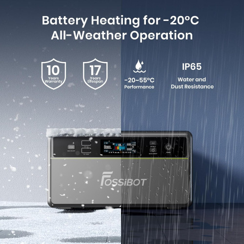 - Rendimiento en cualquier temporada (-20°C a 55°C): Equipado con un calentador de batería inteligente activado por debajo de 0°C, el FBP1200 garantiza una carga segura en climas fríos. Con certificación IP65, es resistente al agua y al polvo. Su amplio rango de operación garantiza un rendimiento estable en todas las condiciones climáticas.