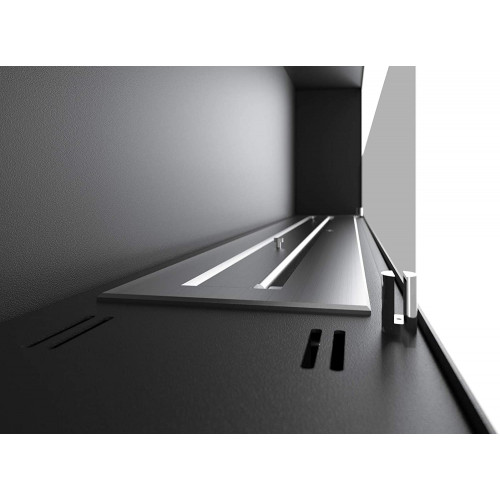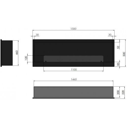 - Dimensiones totales de la biochimenea: 1500 x 500 x 220 mm de profundidad. Dimensiones de la parte empotrada: 1460 x 460 x 200 mm. Quemador único de 100 cm de largo con una capacidad de 3 litros. Material: acero inoxidable de 1,5 mm con recubrimiento en polvo con pintura resistente al calor.