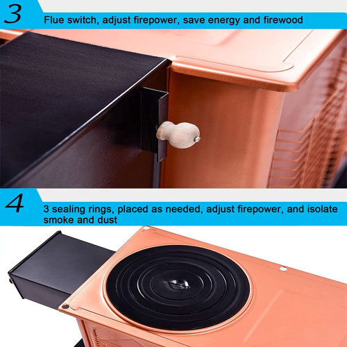 - ★ Tubo del horno: la ventilación secundaria asegura una combustión eficiente y limpia y mantiene el calor en el horno durante más tiempo. 2 tubos de humo, la altura se puede ajustar para adaptarse a diferentes espacios, como carpas o casas pequeñas.