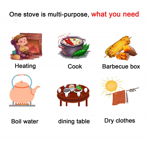 - ★ Fácil de usar y seguro: la estufa utiliza fuentes de combustible naturales, como leña, ramas, astillas de madera, etc. La rejilla de la caja de fuego permite que el aire entre en la madera desde abajo para una combustión más completa y proporciona la capacidad de limpiar , incluso cuando el fuego todavía está encendido. La ventilación vertical se realiza extendiendo el conducto de humos desde la parte superior de la carpa.