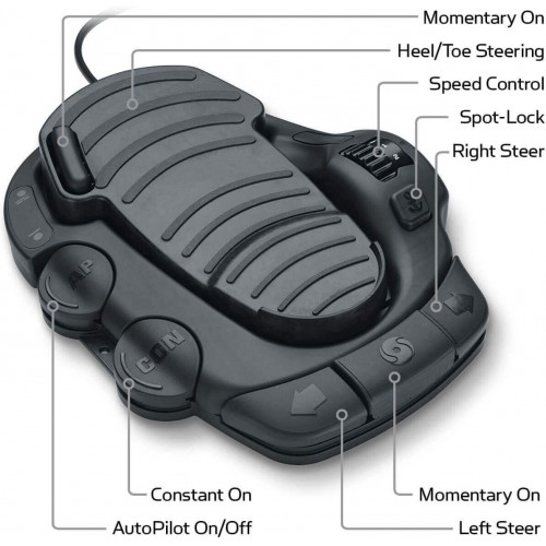 - Un pedal eléctrico de bajo perfil ofrece dos opciones de dirección (pedal de talón/dedo del pie y botones de dirección izquierda/derecha) e incluye activación Spot-Lock, dial de control de velocidad giratorio, momentáneo/constante en el interruptor, y botón de encendido/apagado AutoPilot.