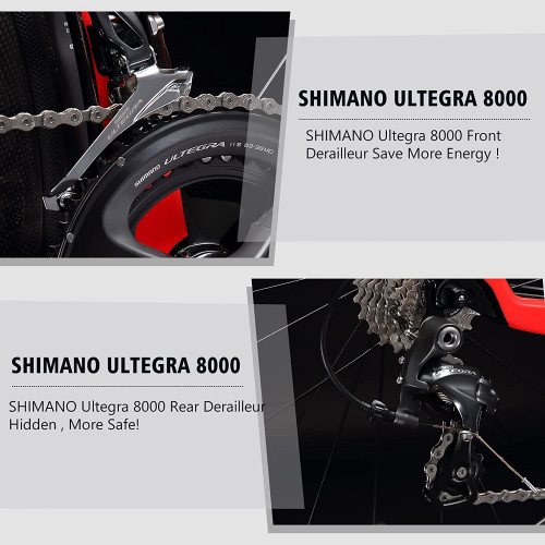 - con SHIMANO Ultegra Group Set -Ultegra 8000 2 * 11 velocidades con palanca de cambio, desviador delantero, desviador trasero, freno en V, bielas 50-34T * 170 mm y rueda libre 11-28T - Le permite comenzar y operar su viaje de manera efectiva, cambios suaves y duradero.