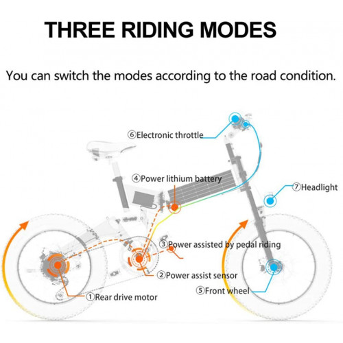 - Tres modos de conducción: [Modo de asistencia de pedal] -El motor le ayudará con potencia continua mientras pedalea la bicicleta. [Modo totalmente eléctrico] -Simplemente gire el acelerador (no es necesario pedalear). [Modo manual]: pisando el pedal como en una bicicleta común.