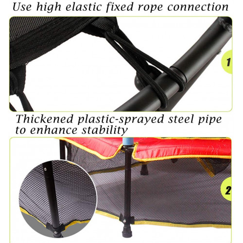 - Buena elasticidad: este trampolín está conectado con 30 cuerdas elásticas de alta resistencia, lo que minimiza el ruido, la almohadilla de salto resistente al desgaste y a los rayos UV (hecha de PP) puede soportar alta presión.