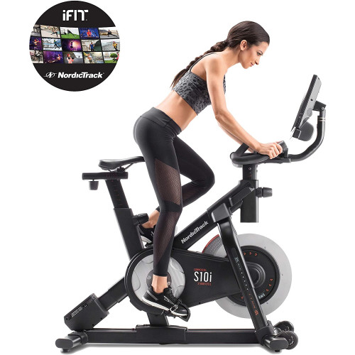 Características de la bicicleta estática Commercial S10i Studio Cycle de NordicTrack: con la bicicleta Commercial S10i de NordicTrack, ahora puedes disfrutar del cross training desde casa y con tu propio entrenador personal. Esta bicicleta de diseño innovador será tu aliado perfecto para lograr un entrenamiento con resultados óptimos. Touch Control de -10 a 20 %: con solo apretar un botón, la bicicleta ajusta al momento la declinación o inclinación de -10 a 20 %. Ventilador Autobreeze: el ventilador ajusta su potencia de forma automática en función de la velocidad de la bicicleta y también puedes seleccionar la intensidad en el panel de control. 1-Touch Resistance Control: con solo apretar un botón, la bicicleta Commercial S10i ajusta al momento la resistencia (24 niveles) para aumentar la dificultad y aportar variedad a los entrenamientos. La pantalla táctil HD en color de 10 pulgadas se puede girar e indica la velocidad, la inclinación, la distancia, las pulsaciones, el tiempo y las calorías. Portabotellas: tendrás la botella de agua a mano durante tus sesiones de cardio para mantener una hidratación adecuada. Sillín y manillar ajustables: el sillín de la bicicleta Commercial S10i Studio Cycle es ajustable y flexible; su manillar también es ajustable para garantizar la comodidad en tus sesiones de entrenamiento. iFit integrado: accede a numerosos programas de entrenamiento (vídeos de entrenamiento) y practica tus sesiones deportivas por todo el mundo o en gimnasio. La bicicleta sincroniza el desnivel y la resistencia en función del recorrido y las indicaciones de tu entrenador (suscripción de 1 año incluida). Ahora puedes personalizar tu propio programa de fitness, disfrutar de sesiones de entrenamiento automáticas y gestionar tu perfil en línea. Pulsaciones cardíacas con el sistema de electrocardiograma (contacto de las manos con los sensores) o mediante cinturón con bluetooth (no incluido), y pesas incluidas.