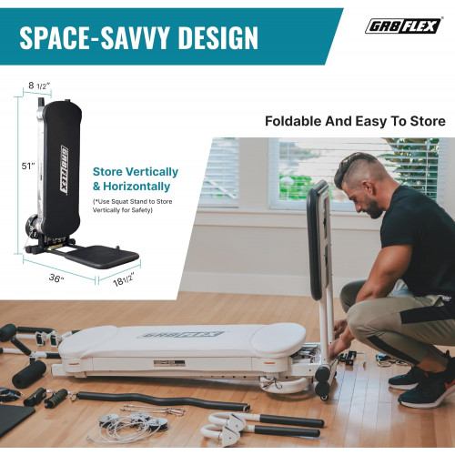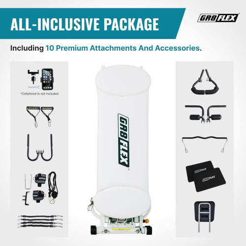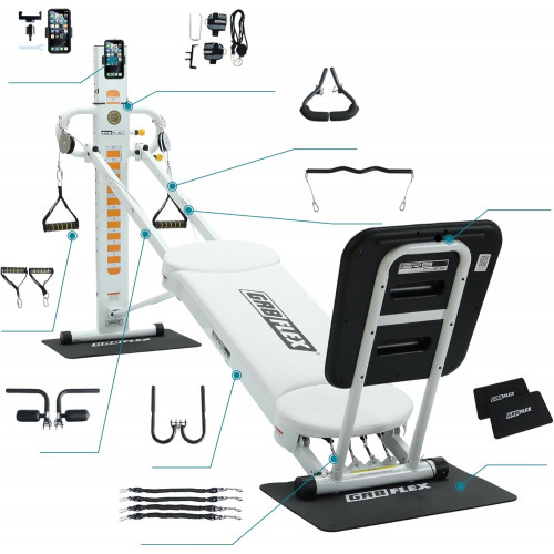 - Todos los accesorios y kits incluidos son: barra de ala, barras de sujeción, arnés de pierna/sistema de polea, soporte de teléfono móvil/soporte, barra de rizo, accesorio de crunch ab, asas de agarre suave, soporte extra grande, bandas de resistencia, y alfombrillas para proteger la alfombrilla/suelo.