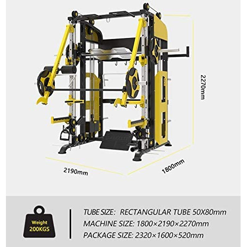 Maquina multifunción TS114 (dobles poleas- multipower) profesional. Maquina profesional, para un trabajo muy completo , para deportistas que quieran trabajar con intensidad y en espacio reducido. Hasta 90 ejercicios a realizar combinando diferentes grupos musculares, quizá la maquina mas completa del mercado. Dispone en la posición: 1º- 2 poleas laterales en cada columna, para poder trabajar con diferentes ángulos, estas poleas están alimentadas de peso por medio de dos columnas de placas. Peso de cada columna: 60 Kg. 2º- Dispone de un multipower, el cual se carga por medio de discos y también puede estar enganchada a las columnas de peso en placas. 3º-Dispone de barra dominadas para trabajo de dorsal con un agarre variable para un trabajo eficaz dependiendo de usuario. 4º-Dispone de brazos centrales para entrenamiento de pecho (press), con carga a discos. 5º-Incluido accesorios de fondos de pecho. 6º-Incluido un soporte para barra recta, para hacer levantamiento. 7º-Equipado con 6 soportes para discos. 8º-Dispone de plancha en barra de multipower para hacer prensa de piernas. 9º-Con doble torre de poleas regulable en altura. (no incluido discos). Medidas maquina: 1800 x 2190 x 2270 cm (alto) Medias embalaje: 2700 x 1730 x 45 mm. Peso en cada columna de placas: 60 Kg. Peso total de la maquina: 480 kg. La barra guiada (cromada) donde se colocan los accesorios mide: 50 x 50 mm. x 22 mm (el orificio de enganche). ESTAS MEDIDAS SON IMPORTANTES POR SI QUEREMOS COMPRAR OTROS ACCESORIOS, QUE NOS ENCAJEN SIN PROBLEMAS.