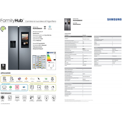 Samsung RS6HA8880S9/EF Nevera Side by Side con Family Hub, Frigorífico 389 Litros, Capacidad Congelador 225 Litros, 406 KwH/Año [Clase de eficiencia energética F]