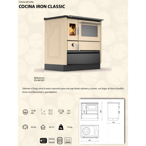 EIDER BIOMASA – Cocina de Leña con horno COCINA IRON CLASSIC 10,08 Kw– Estufa de leña con horno 100x100x75cm – Estilo rectangular – Color Beige [Clase de eficiencia energética A]