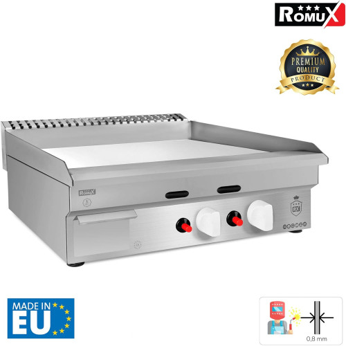 PLANCHA INDUSTRIAL Construcción de acero inoxidable resistente a la corrosión y sin deformaciones.LO MÁS IMPORTANTE 0.8 mm de GROSOR. En nuestros Productos no escatimamos en acero, podrás ver otros y ninguno te indicará el grosor que tiene, ya que usan 0,5 o 0,6 mm, nosotros usamos 0.8 mm.CARACTERÍSTICAS Dimensiones: 1000 (Ancho) x 500 (Fondo) x 230 (Alto) mm. Placa: Cromo Duro.Potencia: 9 kW.Tipo de Gas: Butano.Posibilidad de cambio a Gas Natural.SOMOS FABRICANTES. FABRICAMOS EN EUROPA No fabricamos en China sin standares de calidad. Fabricamos cada línea y esquina cuidadosamente para una limpieza y usabilidad sin preocupaciones.FÁCIL DE INSTALAR Y LIMPIAR La plancha profesional de fácil instalación, para que su técnico la deje a punto en un abrir y cerrar de ojos.