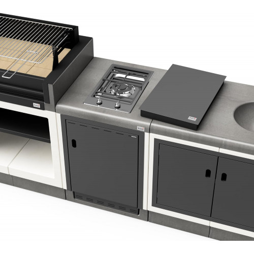 El Pack 4 KITAWAY [F] incluye la barbacoa KITAWAY GRILL 2018, el módulo de soporte KITAWAY, el módulo de pie KITAWAY con fregadero y grifo, el módulo lateral KITAWAY con papelera de reciclaje y la funda para barbacoa KITAWAY, formando un conjunto modular de cocina de exterior ideal para usar con carbón y leña.
