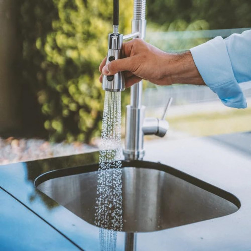 - Para que tu barbacoa se mantenga fresca y las bebidas frescas, la cocina al aire libre está equipada con un frigorífico protegido contra los rayos UV.
