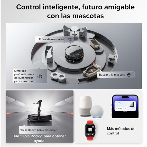 - APP Roborock - Toca. Toca. Limpia(*Solo compatible con Wi-Fi de 2.4 GHz):Con la App potente, puede configurar el brazo mecánico y la modo de limpieza, editar las mapas, buscar y tomar fotos de sus mascotas. Di "Hola Rocky" para pedir ayuda. Tu compañero controlado por voz siempre está listo para ayudarte sin necesidad de red.