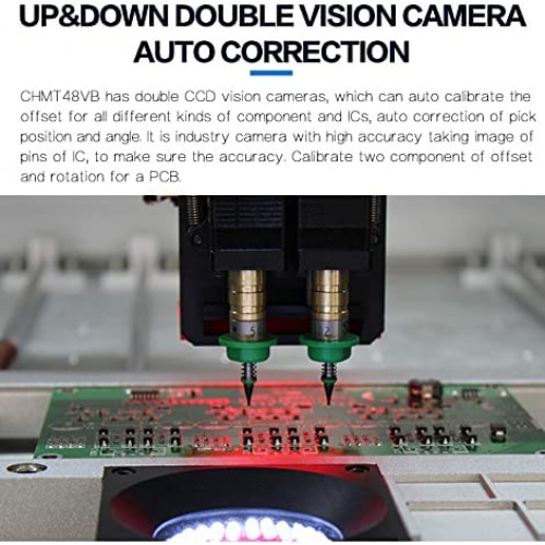 La máquina está completa, lista para trabajar, cada máquina será 100% probada bien, control de calidad aprobado. Compra con confianza. Garantía de calidad, la calidad es mejor que otras máquinas de marca. Descripción: Este CHMT48VB es una versión actualizada de CHMT48VA, que incluye alimentadores laterales dobles con un total de 58 piezas (izquierda 29 piezas + derecha 29 piezas). Es una máquina todo en uno, no necesitas comprar ninguna otra pieza para conectar con la máquina, puedes usarla cuando recibas la máquina, está lista para funcionar. El sistema operativo es el mismo que CHMT48VA y puede instalar más tipos diferentes de materiales, utilizando 502---507 tipos diferentes de boquillas Juki, adecuado para 0402,0603,0805-5050, SOP, QFN, LQFP144, diodo, transistor, BGA... etc., que puede satisfacer la demanda de más clientes. Obtendrás de este enlace: 1) Pick and Place MachineCHMT48VB: 1 2) Alimentador de vibración: 1 pieza 3) Boquilla Juki total 4 piezas (503, 504, 505, 506 tamaño) 4) Controlador USB 8G 1 5) Cable de alimentación 1 6) Aguja de tracción 2 7) Bobina para pin 1 8) Ajuste de posicionamiento de cámara tablero negro ) Llave hexagonal 6 10) Pinzas 1 11) Cepillo 1 12) Bolígrafo para pantalla táctil 1 13) Accesorio para bandeja IC 4 14) Grasa 1