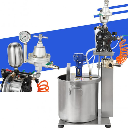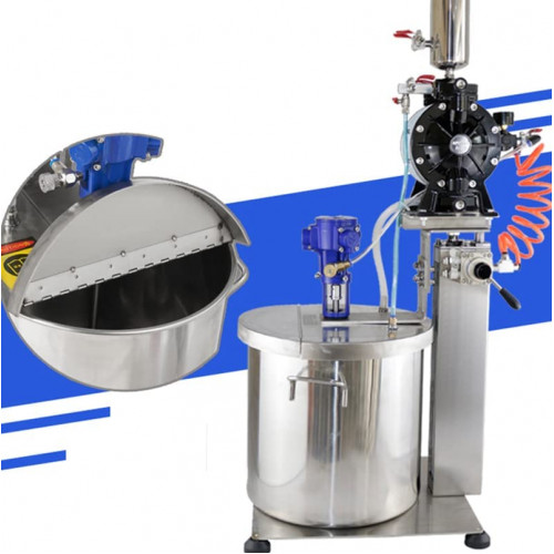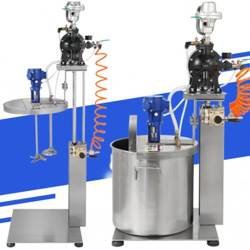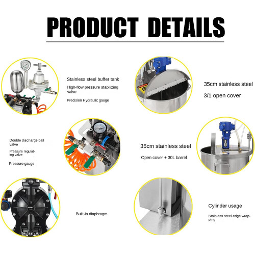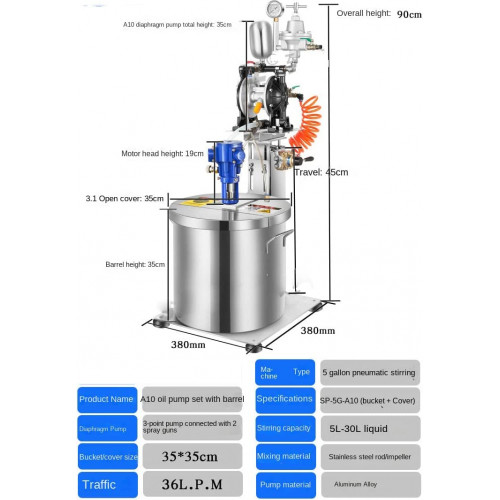 ★Parámetros: Material de agitación: varilla/impulsor de acero inoxidable; material de la bomba: aleación de aluminio; bomba de diafragma: 3 subbombas conectadas a 2 pistolas pulverizadoras; Cubo/tamaño de la cubierta: 35*35cm; caudal: 36L.P.M; capacidad de agitación: 5L-30L líquido.