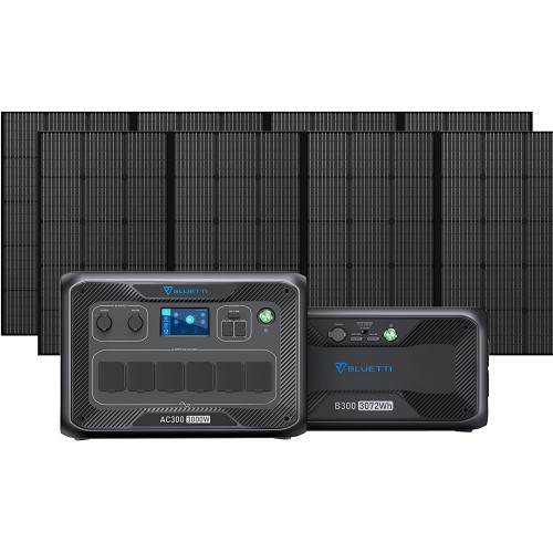 - BLUETTI AC300 Powerstation, batería de expansión B300, 2 paneles solares PV350, cable de carga de CA multifuncional cable de carga de CC cable de carga para coche manual de usuario, 4 años de garantía