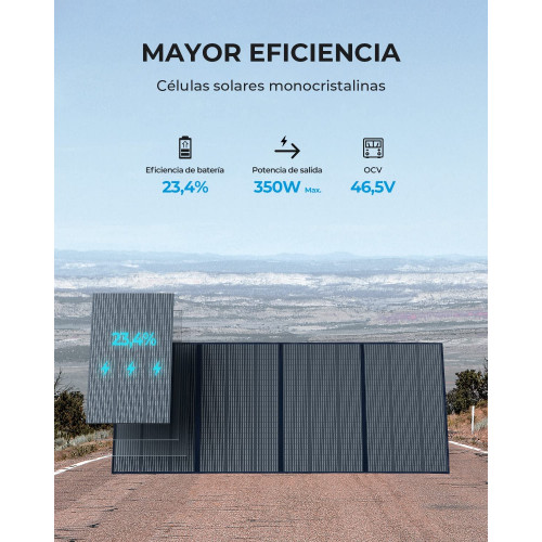 - [Alta eficiencia celular] - El panel solar PV350 está equipado con paneles solares monocristalinos y puede convertir hasta un 23,4 % de la luz solar en electricidad utilizable, lo que le permite obtener energía solar incluso en días nublados.