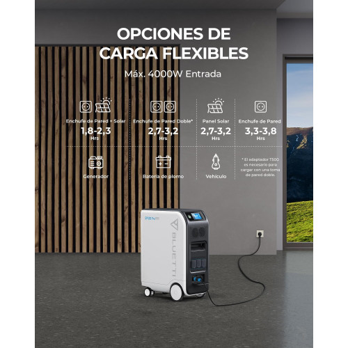 - [Carga Flash] - EP500Pro se puede cargar en solo 1,8 horas a través de una carga dual de 2400W PV + 3000W CA (se requiere un cable de carga de 30A CA) para alcanzar una potencia de entrada máxima de 4000 W.