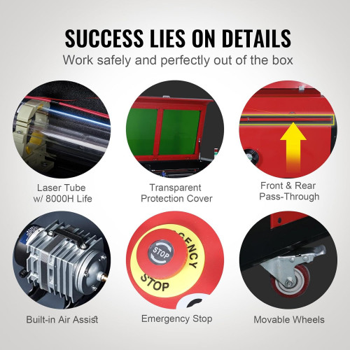 - Operación fácil y segura: La ventana de visualización transparente con protección ocular tintada le permite monitorear el progreso del grabado en cualquier momento y puede cortar automáticamente la energía cuando se abre. Una parada de emergencia está lista en caso de que algo salga mal. Nuestro grabador láser también tiene una asistencia de aire incorporada para eliminar todo el humo, el polvo y las chispas, y las ruedas móviles facilitan el movimiento.