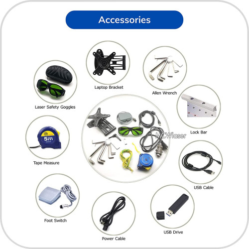 • MCWlaser fibre laser engraver for industry and business. Power: 50W/220V Engraving Area: 220x220mm (8.7"x8.7"). Package includes fibre laser engraving machine, convenient 8-piece tool set and professional laser goggles (CE certificate)