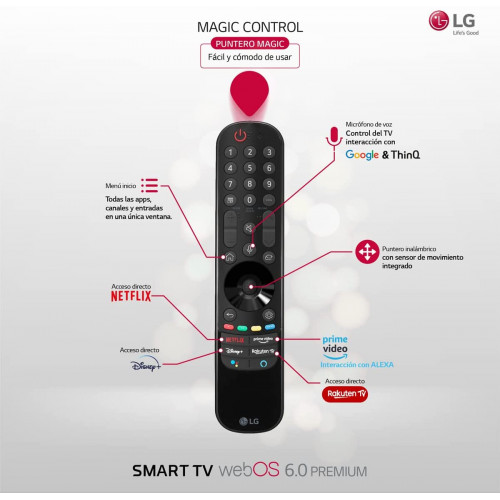 - Conectividad con 2xHDMI 2.1 / 2xHDMI 2.0, 3xUSB 2.0, WiFi (802.11ac), Bluetooth V5.0, LAN RJ45, Magic Remote incluido