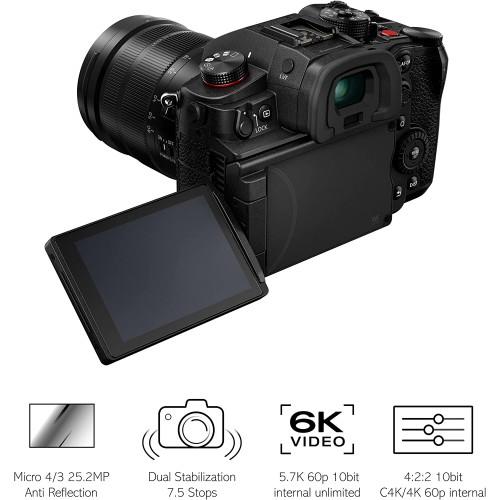 • Cámara sin espejo LUMIX G con un sensor MOS de 25.2 megapíxeles y funciones de grabación de vídeo C4K/4K a 60p/50p 4:2:2 de 10 bits; Kit de objetivos LEICA DG de 12-60 mm (24-120 mm)