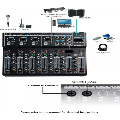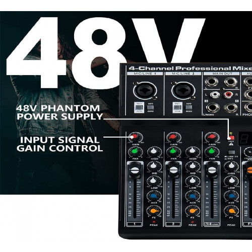 Con 4 entradas mono (combinación de micrófono y línea), 1 estéreo RCA Entrada, 1 L & RLINE ENTRADA Con ganancia de entrada. Ajuste alto / medio / bajo de sonido. Fuente de alimentación fantasma incorporada de 48V, adecuada para la alimentación directa de micrófonos condensadores. Con reproductor de MP3, USB Entrada, con función Bluetooth. Con la interfaz informática para satisfacer las necesidades de la transmisión en vivo. Puerto de salida de auriculares de alta definición. Controlador de fader de alta precisión para cada canal Efector digital 9 9DSP