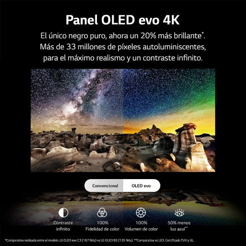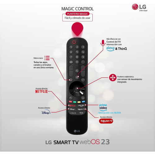 • Ecosistema abierto e inteligente: Smart TV webOS23, compatible con Apple Home Kit/Airplay/Google/Alexa/ThinQ, y control por voz sin mando.